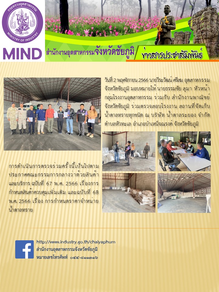 จังหวัดชัยภูมิ ร่วมตรวจสอบโรงงาน สถานที่ จัดเก็บน้ำตาลทรายทุกชนิด ณ บริษัท น้ำตาลระยอง จำกัด ตำบลหัวทะเล อำเภอบำเหน็จณรงค์ จังหวัดชัยภูมิการดำเนินการตรวจร่วมครั้งนี้เป็นไปตามประกาศคณะกรรมการกลางว่าด้วยสินค้าและบริการ ฉบับที่ 67 พ.ศ. 2566 เรื่องการกำหนดสินค้าควบคุมเพิ่มเติม และฉบับที่ 68พ.ศ. 2566 เรื่อง การกำหนดราคาจำหน่ายน้ำตาลทราย