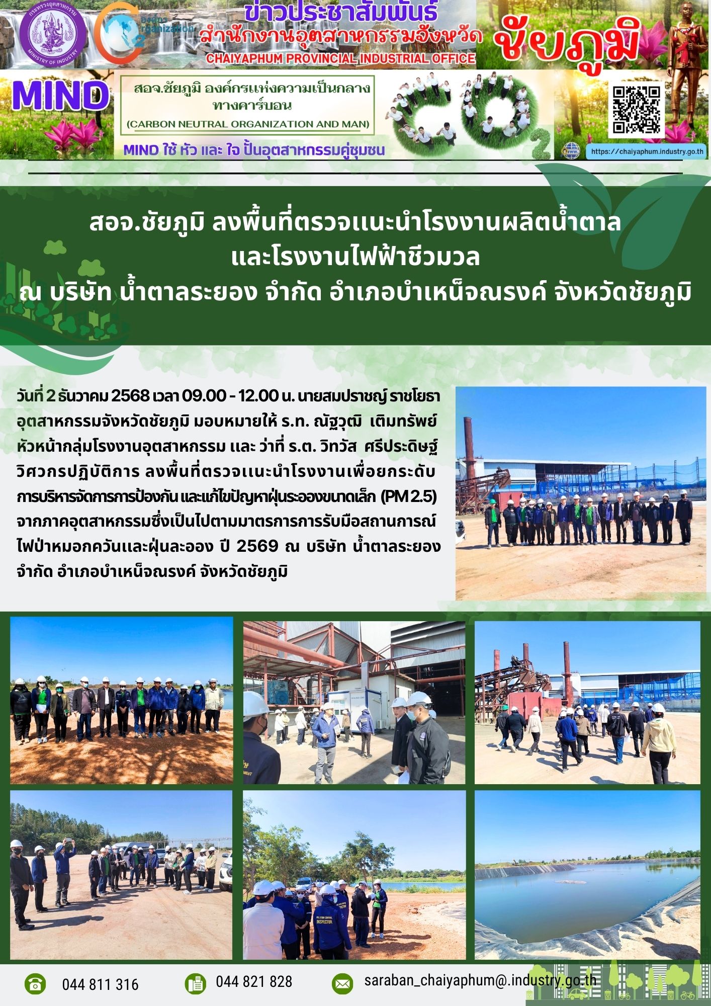 สอจ.ชัยภูมิ ลงพื้นที่ตรวจเเนะนำโรงงานผลิตน้ำตาล และโรงงานไฟฟ้าชีวมวล ณ บริษัท น้ำตาลระยอง จำกัด อำเภอบำเหน็จณรงค์ จังหวัดชัยภูมิ