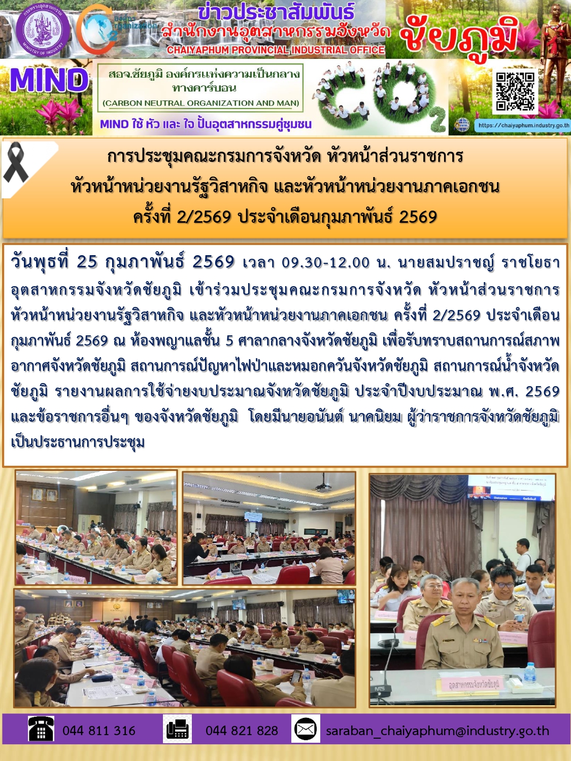 อุตสาหกรรมจังหวัดชัยภูมิ เข้าร่วมประชุมคณะกรมการจังหวัด หัวหน้าส่วนราชการหัวหน้าหน่วยงานรัฐวิสาหกิจ และหัวหน้าหน่วยงานภาคเอกชน ครั้งที่ 2/2569 ประจำเดือนกุมภาพันธ์ 2569 ณ ห้องพญาแลชั้น 5 ศาลากลางจังหวัดชัยภูมิ เพื่อรับทราบสถานการณ์สภาพอากาศจังหวัดชัยภูมิ สถานการณ์ปัญหาไฟป้าและหมอกควันจังหวัดชัยภูมิ สถานการณ์น้ำจังหวัดชัยภูมิ รายงานผลการใช้จ่ายงบประมาณจังหวัดชัยภูมิ ประจำปีงบประมาณ พ.ศ. 2569
